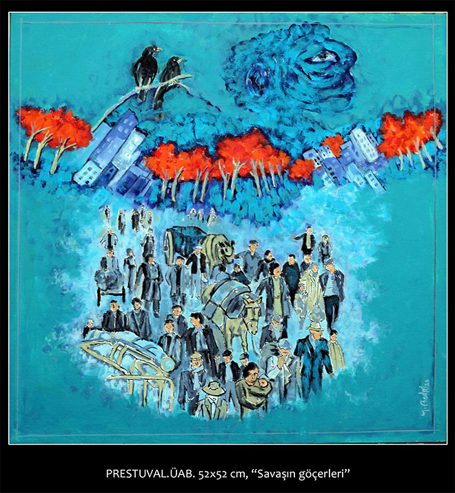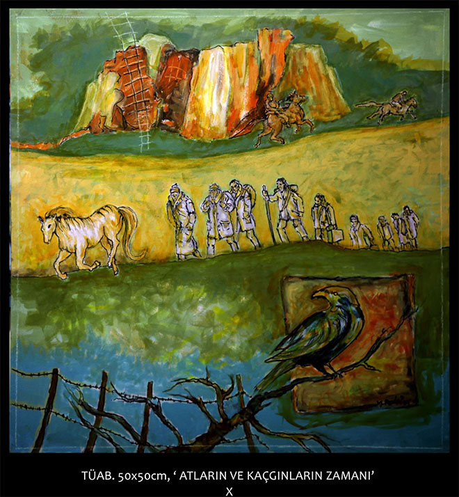 Yaşam alanlarının daralması, zorunlu göçler, karmaşa, örtünme, geri çekilme, içe kapanış, şiddet ve teknoloji şüphe yok ki resmin temalarına da etki etmektedir.